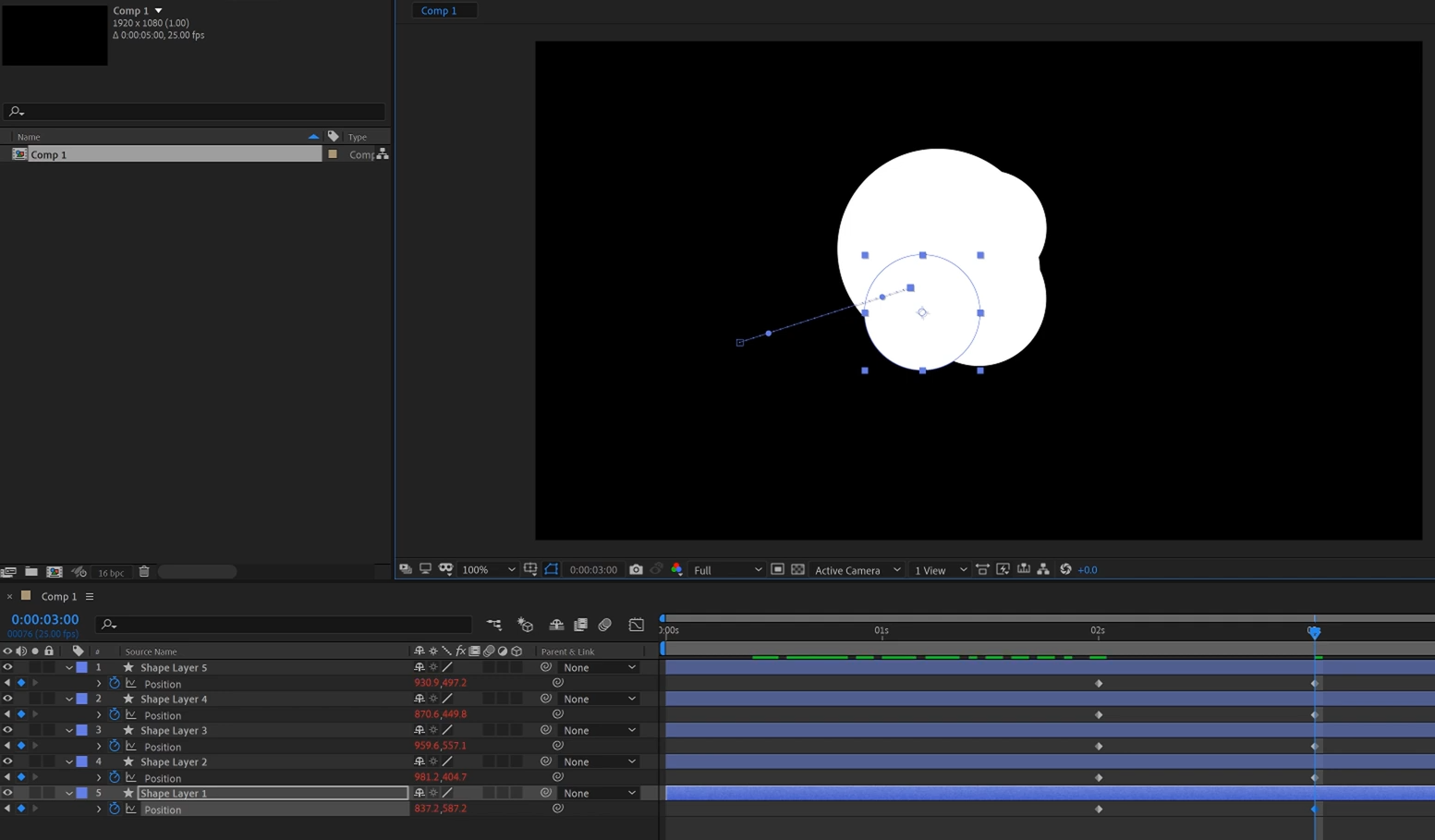 04. 복제된 레이어들을 일정한 간격으로 위치 이동해서 가운데로 결집하는 키프레임 애니메이션을 주세요.
