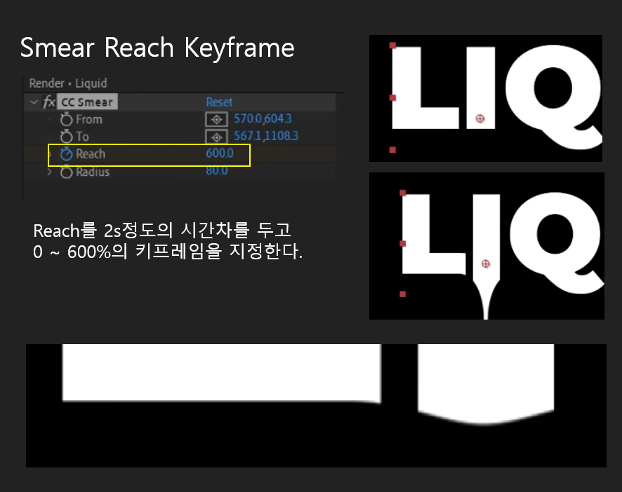 아이스크림이 텍스트 등 녹아내릴 형상이 있는 특정 레이어에 스미어 Smear효과를 적용하고 From과 To의 좌표는 같은 값으로 지정해 줍니다. 요약하면 키프레임의 변화는 아래 순서대로 적용해줍니다.