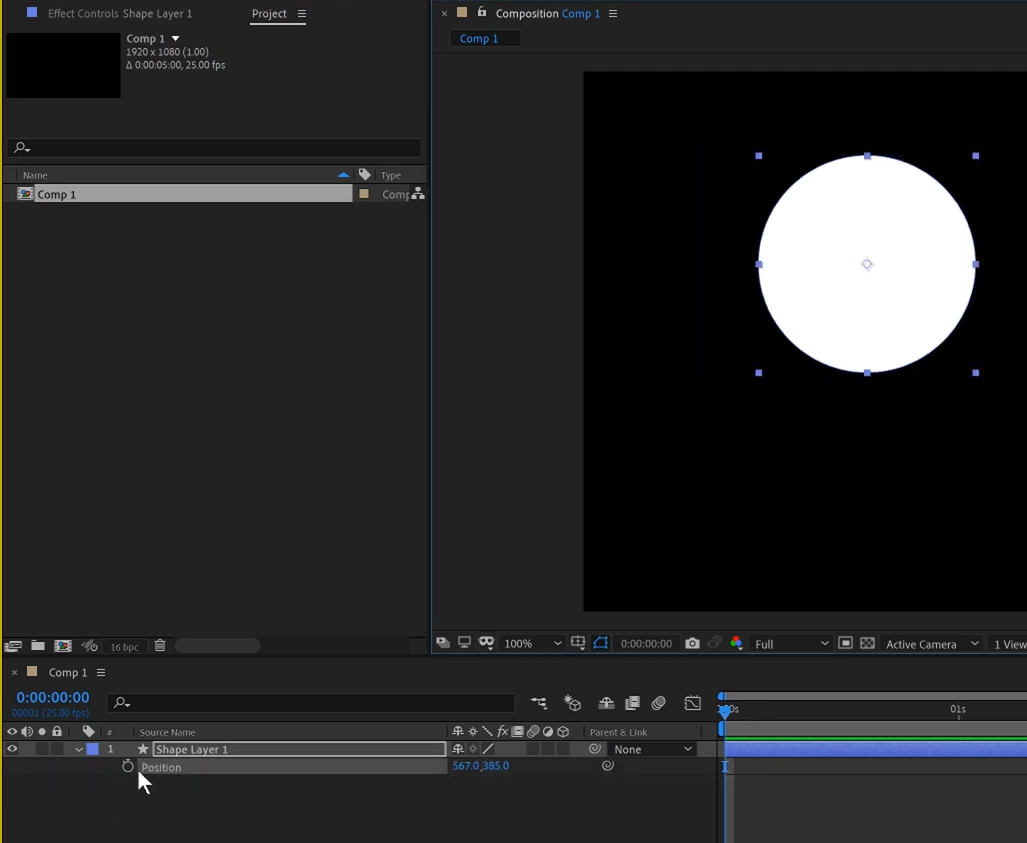 01. 콤프를 만들고 원형의 Shape를 하나 그려주고 중심을 CA+Home 키를 눌러서 중앙에 맞춰 줍니다.