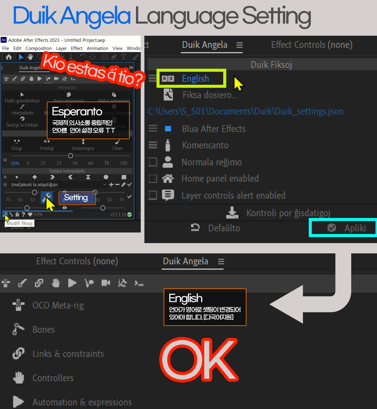 Esperanto 기본언어로 되어있습니다. 국제적 의사소통 즁립적인 언어!!!! 언어 설정 오류 T T..... 이렇때에는 하단에 Setting 을 누르고 [A-D] Esperanto 부분을 클릭하면 다국어를 지원하는 듀익 앙겔라의 언어가 변경됩니다. English로 바뀌면, Apliki 적용 [Apply]라는 뜻의 에스페란토 언어 입니다. 일단 Apliki를 누르면 잠시 기다리면 English로 변경된 것을 볼 수 있습니다.