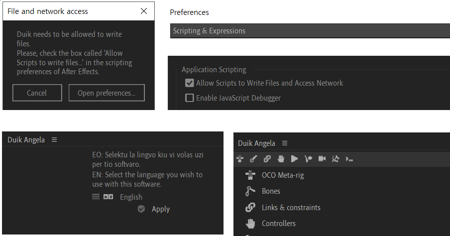 05. 해주면 File and network assess창이 뜨고, Open preferences...를 클릭해서, 설정창으로 이동하면 Application Acripting 카테고리의 상단의 Allow Scripts to Write Files and Access Network항목을 체크하고 OK를 누릅니다. Duik Angela창에서 Appy를 누르면 연결되어 다양한 Duik Angela의 카테고리별 도구들을 사용할 준비가 된 것입니다.