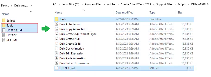 03. 압축푼 폴더내의 Tools폴더와 LICENSE.md파일을 Duick Angela폴더에 그림과 같이 붙이기를 합니다.