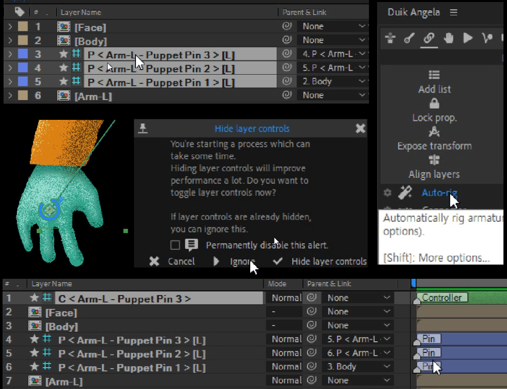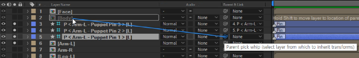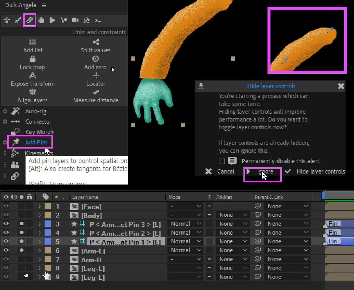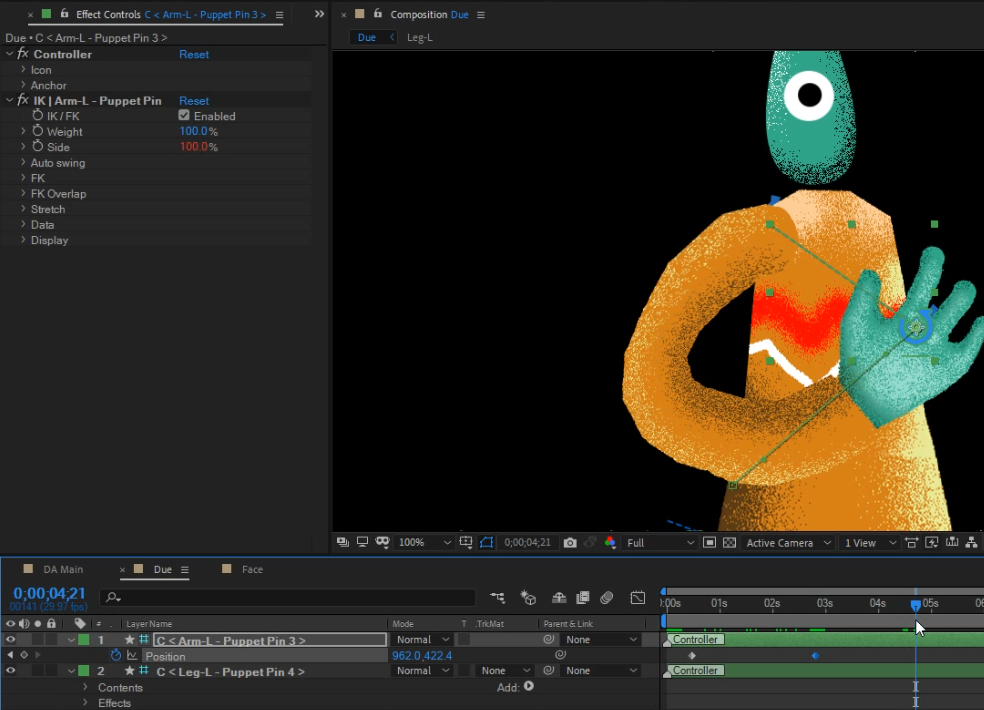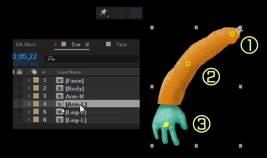 Duik A. 연결된 하나의 레이어'팔,다리'의 경우는 Puppet Pin을 이용한 방법