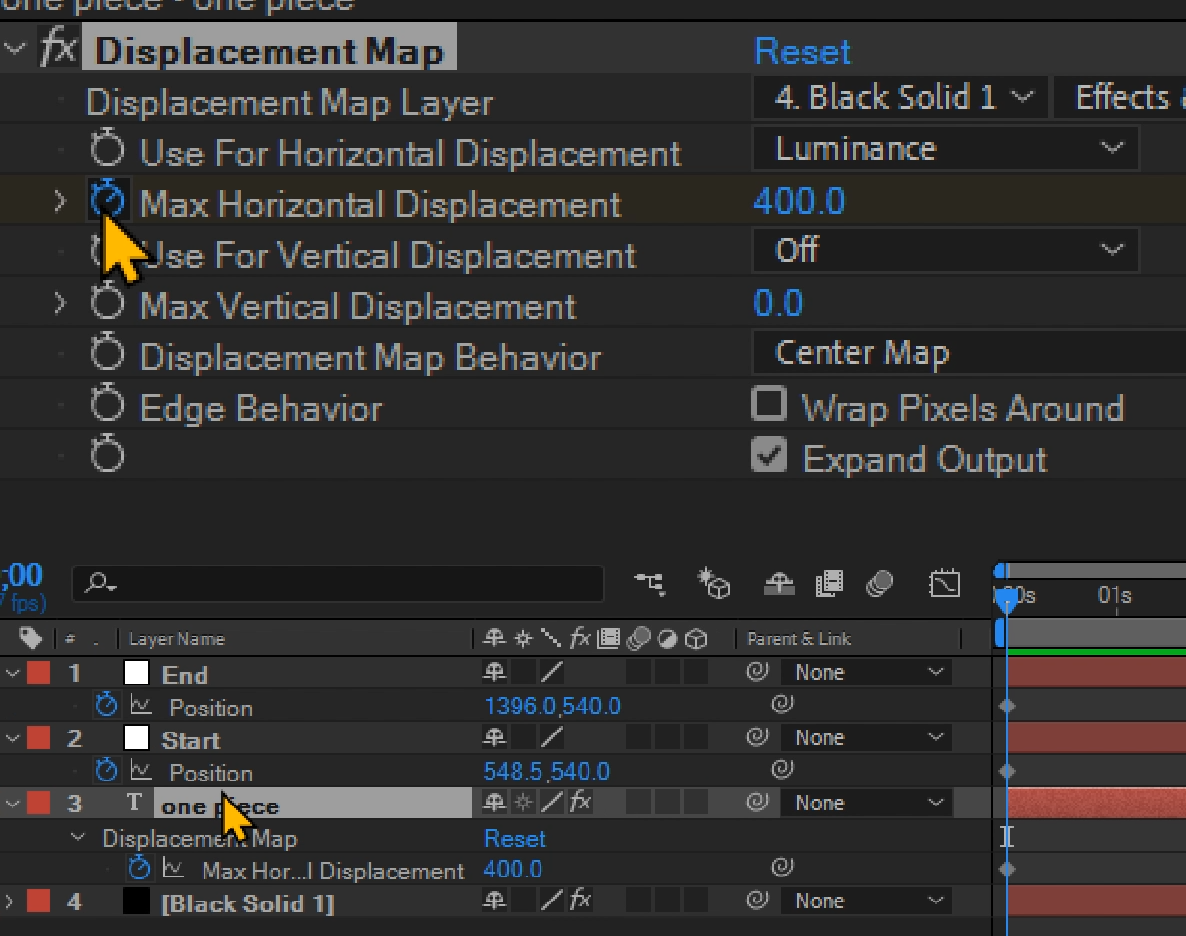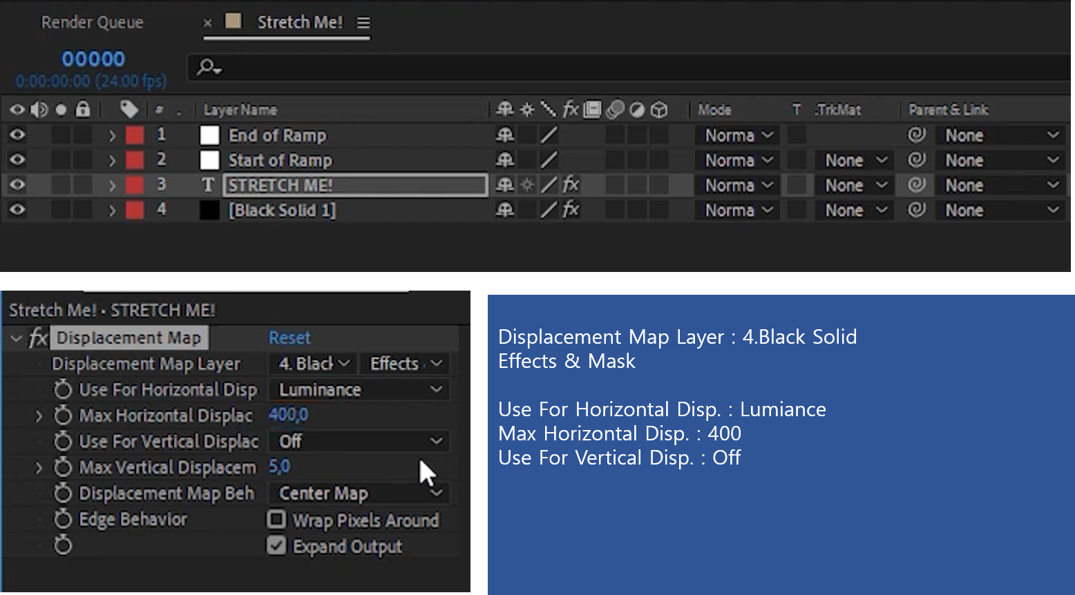 04. Text레이에에 Displacement Map을 적용하고 Displacement Map Layer를 4.Black Solid로, 옵션을 Effects & Mask로 바꿔준다.(항목명이 길어서 Effects 일부만 보임)