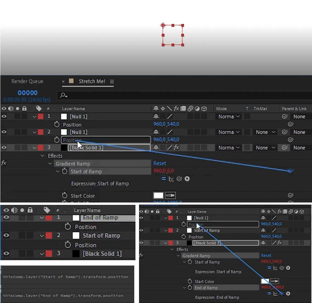 02. Null 레이어를 추가하고 복제해서 2개를 준비한다. 첫번째 Null의 움직임인 P를 준비하고 Gradient Ramp의 Start of Ramp의 모기향을 이 Null에 연결시킨다. Null의 이름을 구분하기 위해 Start of Ramp라고 바꿔준다. 맨위 복제한 두번째 Null에도 같은 작업을 진행하며 각각 다른 Expression이 추가된다.