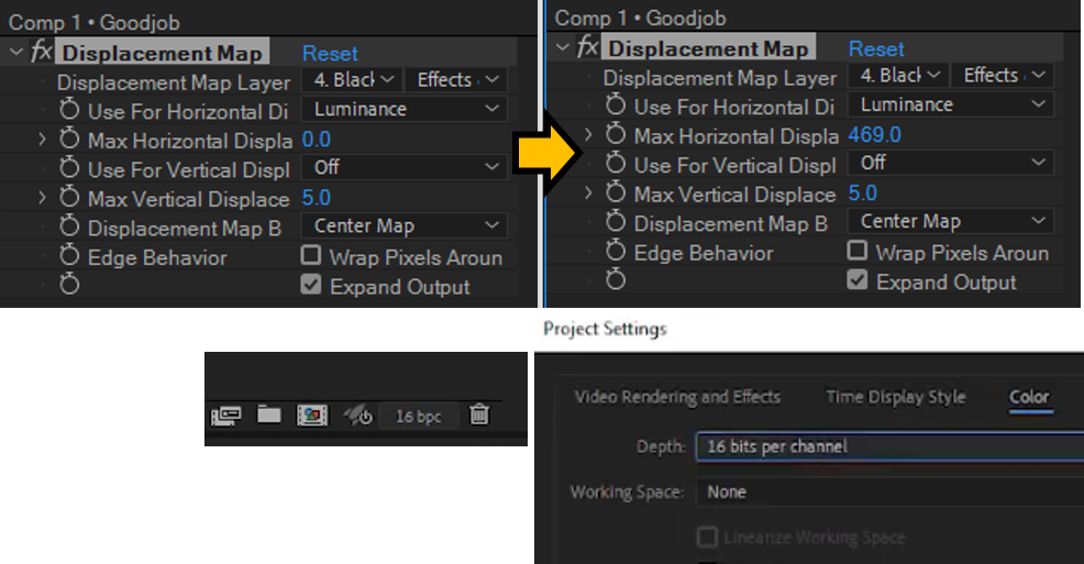 05. Soild Layer는 감추고 Text의 Max Horizontal Displacement. 값을 기본값 0에서 약 473정도(글씨크기에 따라 다름)로 값을 주어 늘어지는 장면을 연출해보고, 아직 키프레임을 만들지 않는다. 프로젝트 셋팅(CAS+K Project Settings)에서 Color를 16bit로 바꿔준다. 퍼지는 현상을 막기위함이다.