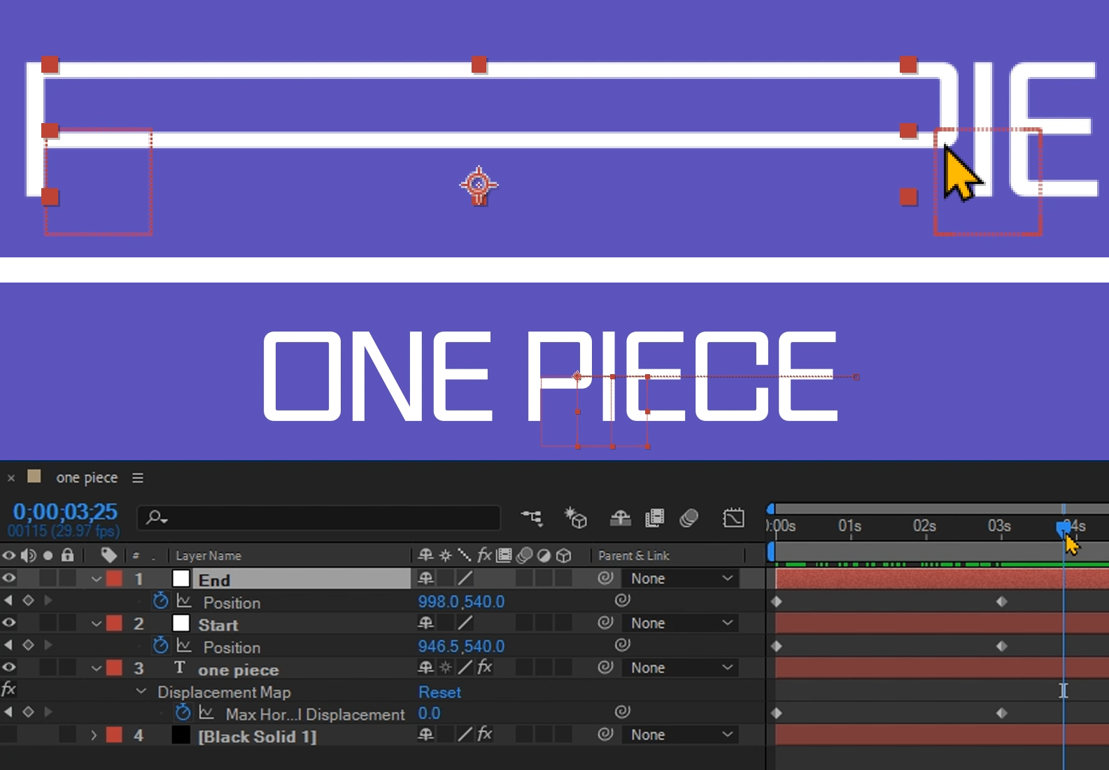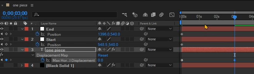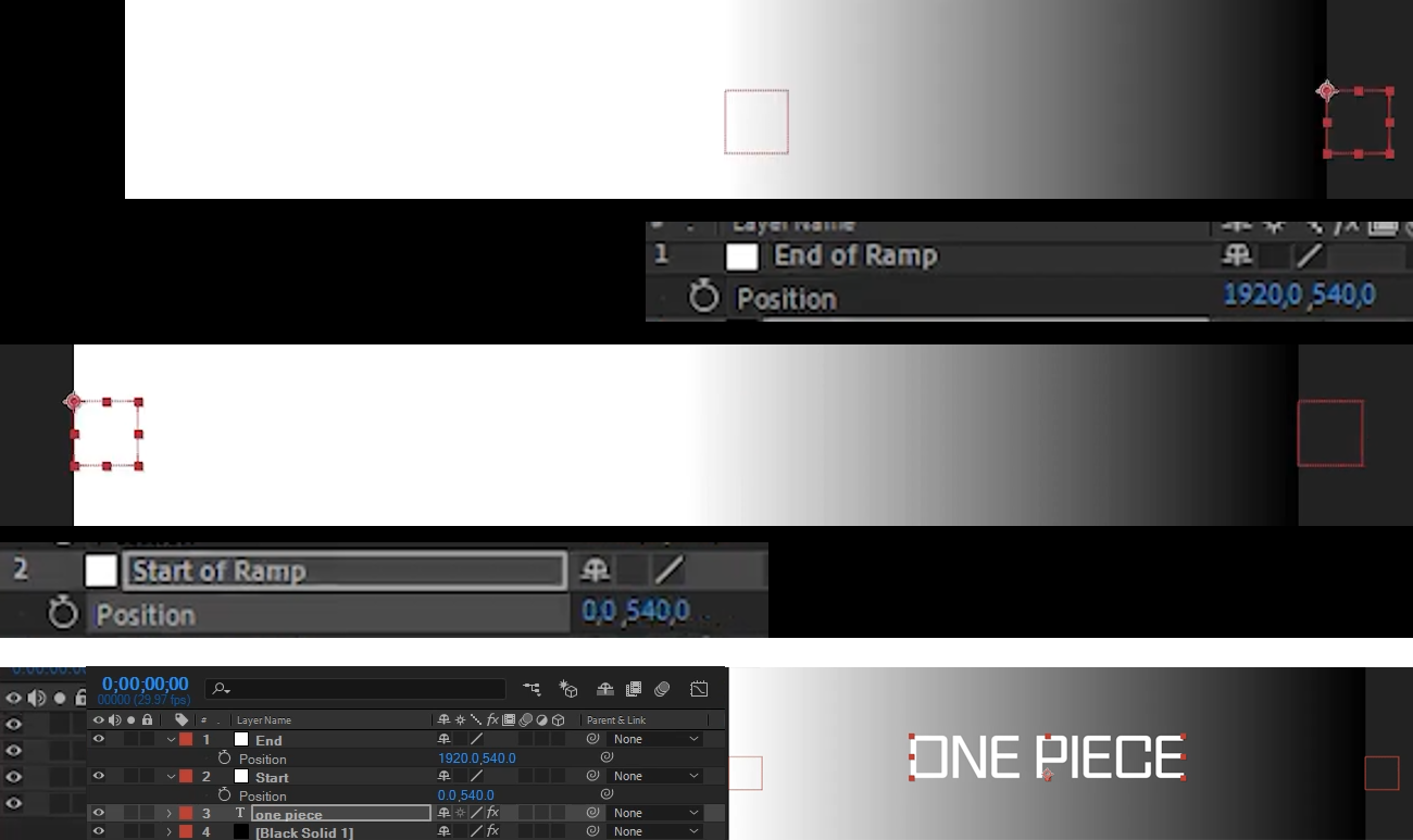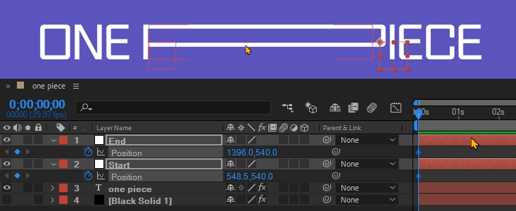 03. Null End는 X축의 값을 1920, Null Start는 X축의 값을 0으로 수정해 준다. Black Sold레이어를 맨 아래로 배치해준다.