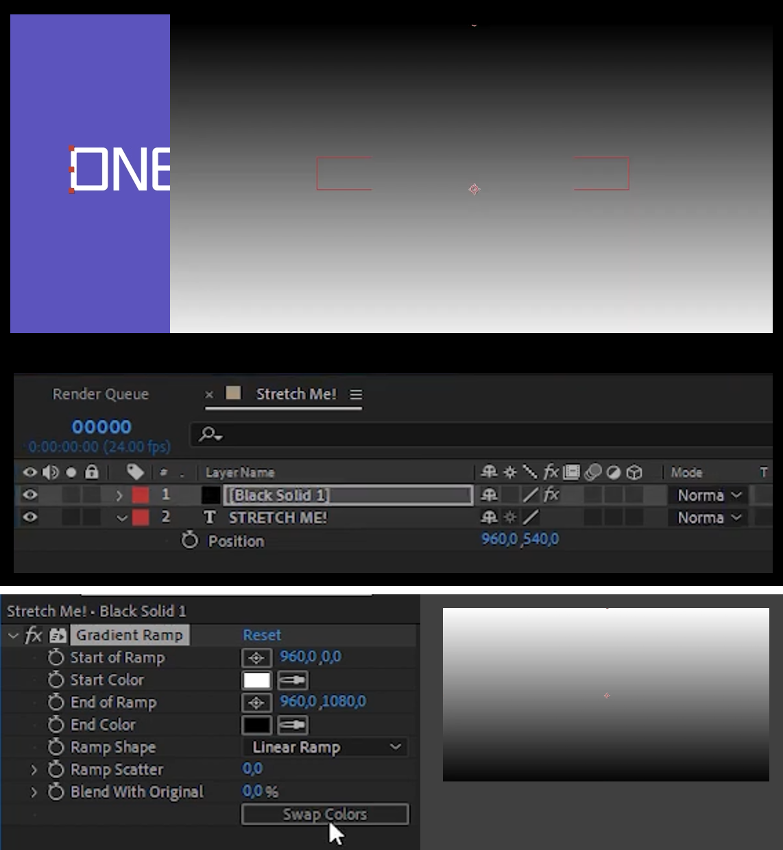 01. 고딕계통의 글씨입력하고 / 검은색 Solid 레이어 추가 후 Gradient Ramp 효과 검색해 솔리드에 적용하고 Swap Colors버튼을 눌러 색을 바꾼다.