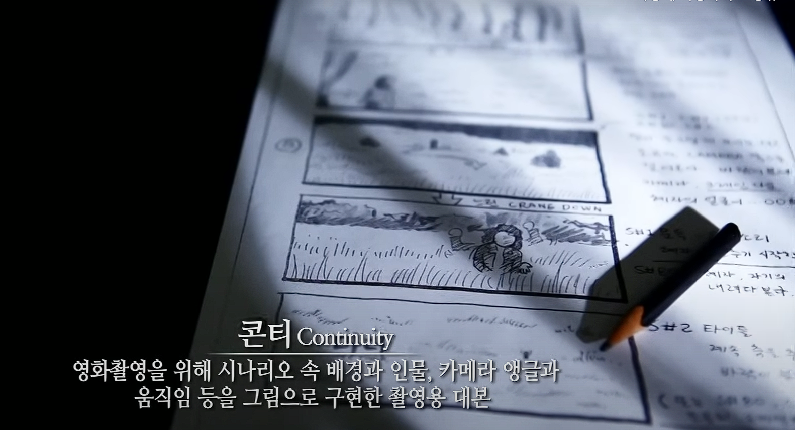 봉준호 감독의 콘티는 유명하다. 주요장면과 카메라, 배우들의 동선을 만화컷처럼 그려내고 그대로 촬영에 반영하여 봉테일이라는 별명까지 있습니다. 영화, CF, 브이로그에서도 촬영자는 촬영 전 콘티를 파악하여 미리 샷을 구상해보고 구도를 생각한 후 촬영을 진행하면 좋다.