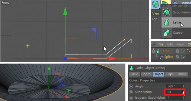 01. Front 뷰에서 접시모양의 우측면을 펜툴로 Spline을 그리고, Lathe를 추가해서 스플라인은 레스에 속하게하여 접시를 완성한다. Subdivision값에 따려 면이 추가되어 부드럽게 보인다.