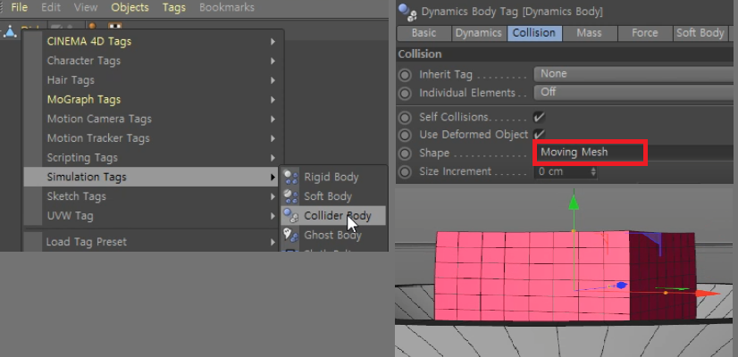 02. 접시에는 콜리더 바디로 바닥이 되게 지정해 주고, 콜루션 옵션중 Shape는 Moving Mesh로 지정해준다. 담길 형태가 내부까지 들어가게하는 중요 속성이다.