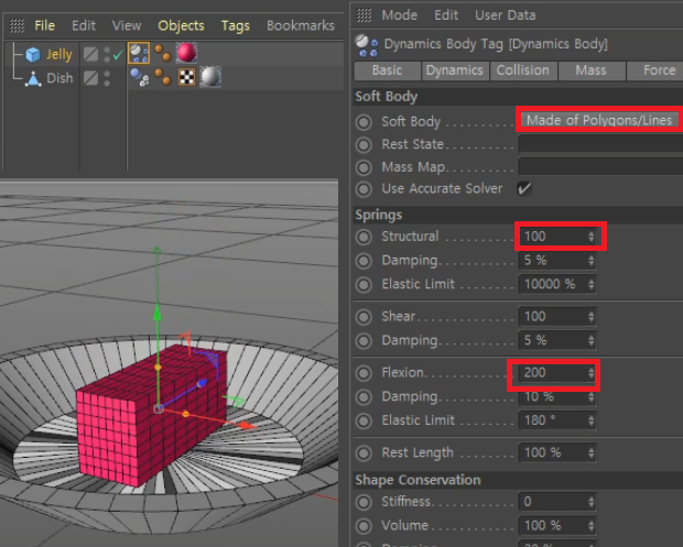03. 떨어질 큐브를 추가하고 Segment수는 10정도 분할 해준다. N-B를 눌러서 각기 면이 나눠진 것을 확인한다. 큐브는 Jelly라고 이름을 바꾸고 우클릭해서 Simulation Tag - Softbody를 속성을 추가해주고, Soft Body 탭에서 아래 그림과 같이 중요 속성을 준다.