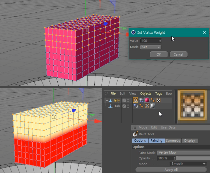 02. Set Vertex Weight의 값은 100% 주고 OK버튼을 누른다. 픽셀화된 부분의 아이콘이 추가되고 오브젝트는 열병을 앓고 있는 것 처럼 Yelllow 선택영역과 Red 비선택영역이 구분되어 보여진다.