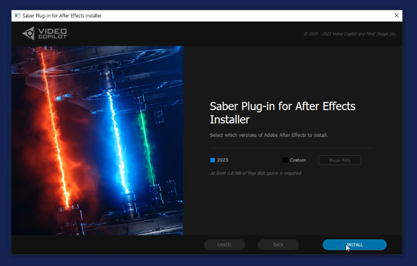 세이버의 사용을 위해서는 위 URL로 가서 플러그인을 다운로드 후 설치를 해야 사용할 수 있습니다. 애프터이펙트가 실행중이면, 저장 후 닫고 세이버를 설치한 후에 애프터이펙트를 열어야 합니다. 설치과정은 비교적 간편하게 설치가 됩니다.