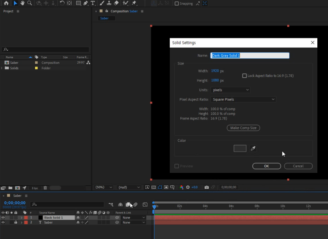 02. Solid 레이어를 그위에 생성하고, Solid레이어에 Saber효과를 검색해서 적용합니다.