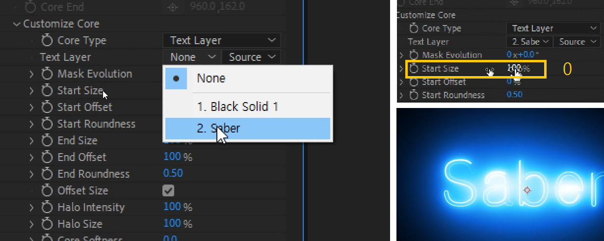 04. 원본 Text Layer 활용을 위해위해서 항목 Customize Core에서 Type을 Text Layer를 선택하고, 아래 Text Layer의 항목에서는 준비된 아래 Text를 최종선택하고 Starter Size를 100%이하로 조절하면 글씨에 광선 효과가 적용됩니다.