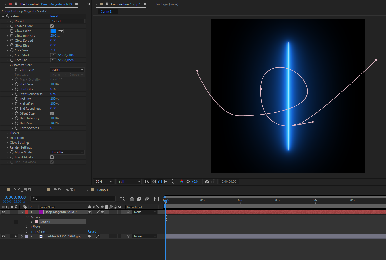 위 튜토리얼을 캡쳐한 이미지 혹은 아래 링크를 통해서 유튜브의 After Effects Saber Tutorial을 참고해서 상상력을 더해 멋진 작품을 제작해보세요.