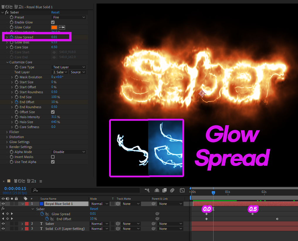 Saber Fx 조건 Text Layer / 솔리드레이어(C+Y) 그 위에 생성 솔리드레이어에 Fx적용