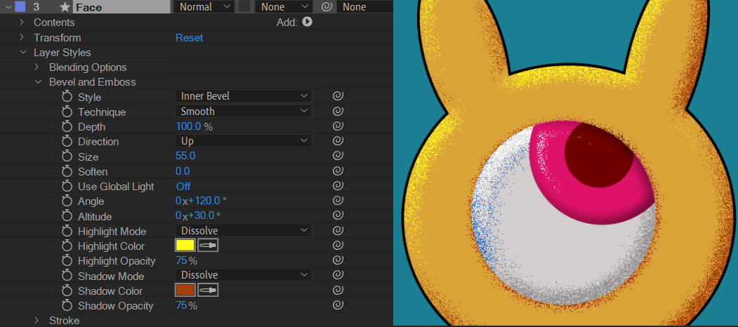 간단하게 표현하는 방법 Layer Style의 Bevel & Emboss, Inner Shadow 등에 Blend Mode중에서 Dissolve를 지원하기때문에 거친 질감으로 음영인 Grain Shading을 표현할 수 있습니다.