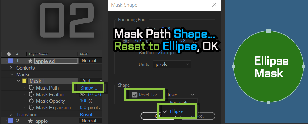 02. 적용된 Mask는 Rectangle Mask는 다른 형태인 타원 Ellipse Mask로 변환할 수 있습니다. Mask1에서 Mask Path에 속한Shape... 를 클릭하면, Mask Shape Window가 뜹니다. 중간에 있는 Shape 부분에서 Reset to를 체크하고 / Ellipse 선택한 다음 / OK 버튼을 누르면 타원형태로 Mask가 바뀝니다.