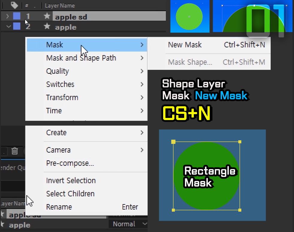 01. Shape Layer에서 우클릭(RMB)누르고 Mask - New Mask 간단하게는 CS+N키로 Mask를 적용할 수 있습니다.