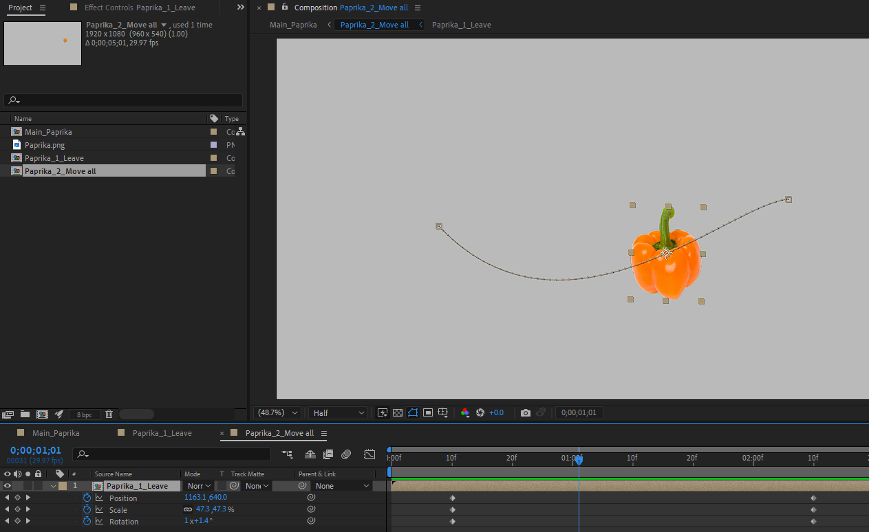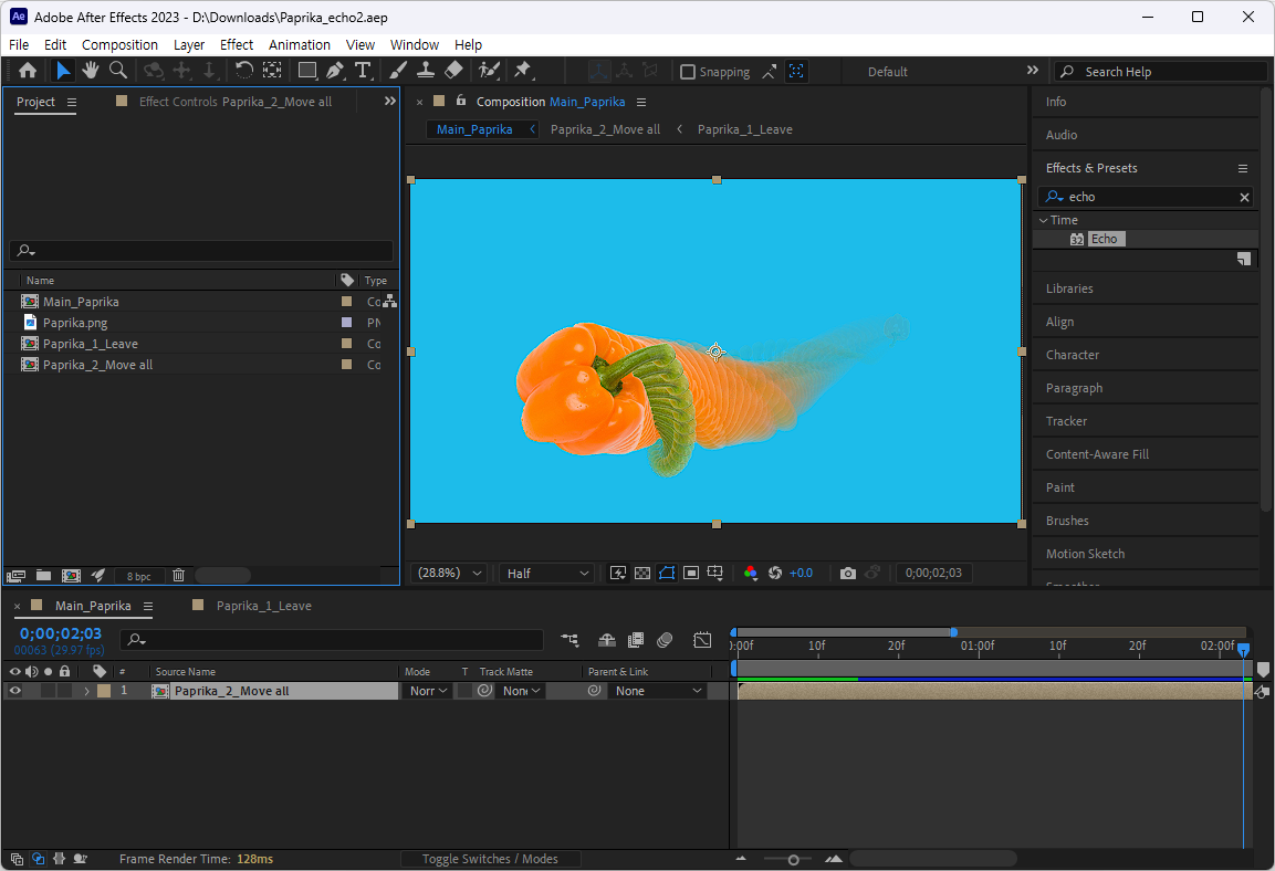 바로 메인에서 그 1차 콤프를 선택한 상태에서 키프레임을 반영한 움직이는 2차 프리콤포즈를 Move 옵션으로 생성합니다. 메인에서 단순한 움직임이 보이는 이 2번째 재가공한 콤프는 에코의 대상이 됩니다.