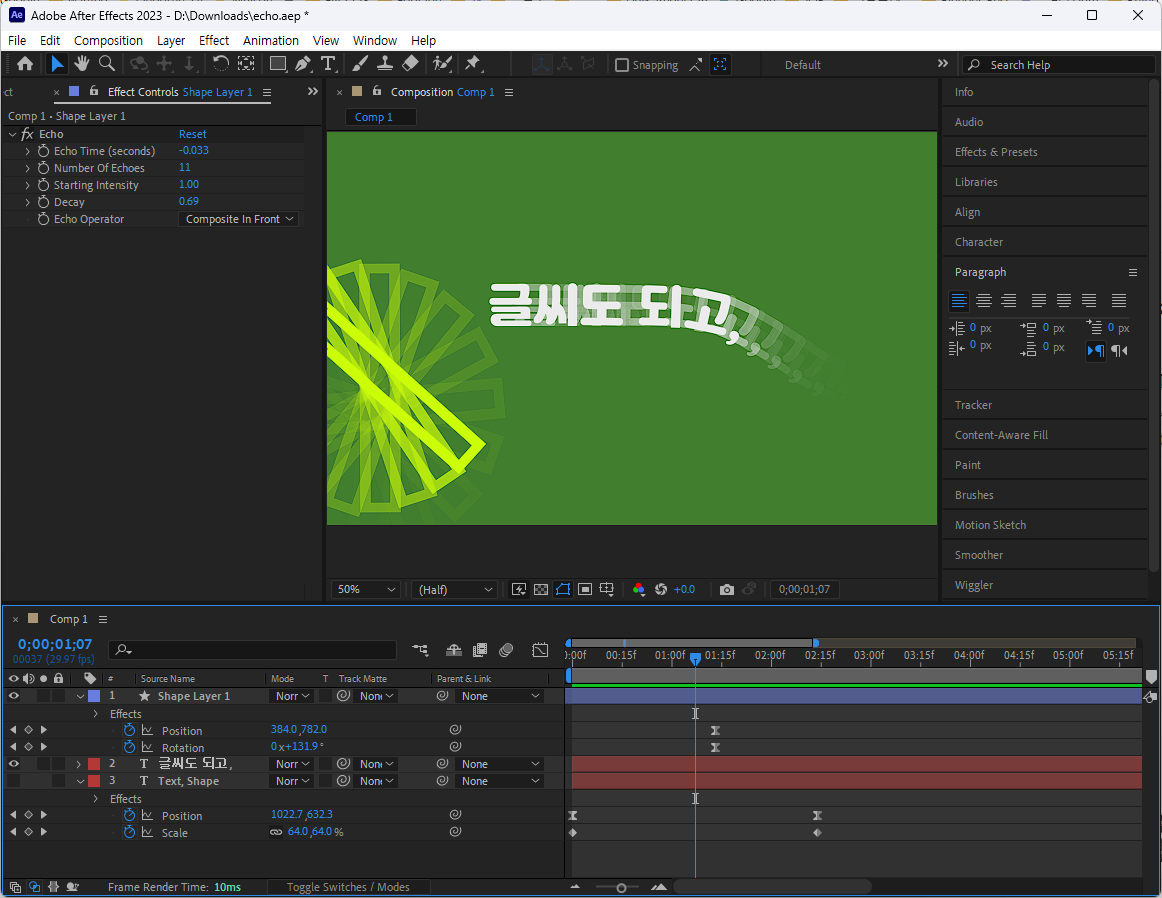 02. Effect Control의 Echo 속성을 아래 그림의 값을 참고해서 수정한다.