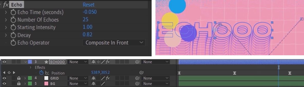 특정레이어의 위치/이동/회전 등 변형(Transform)의 값 중에서 이동(Positon)에 가속도가 반영된 키프레임의 운동형태의 잔상을 만들어 주는 Time - Echo는 오디오에서도 메아리 처럼 뒤늦게 들려오는 부분에도 사용하는 효과입니다. 벡터형식의 Text와 Shape에는 동일한 효과가 적용되고, 비디오 파일에도 움직임이 있는 경우에 반영할 수 있습니다.