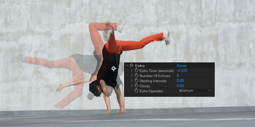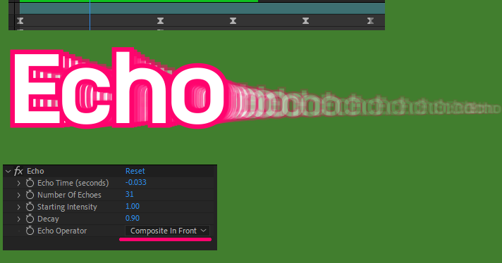echo 효과를 정확하게 속성과 값을 정하기 쉽지 않지만, 아래 Echo Time의 경우 원본과 이어지는 잔상들의 간격과 관련되어 민감합니다. Minus - 값을 우측으로 Ctrl키를 누르며 값을 세밀하게 증감하여 처리합니다. 잔상의 명확성과 불투명도는 Echo Operator에서 결정되는데 피사체와 같이 선명한 처리는 Minimum / 불투명도 같은 매트릭스 장면같은 잔상이 남길 경우는 Composite In Back을 지정해 주세요.