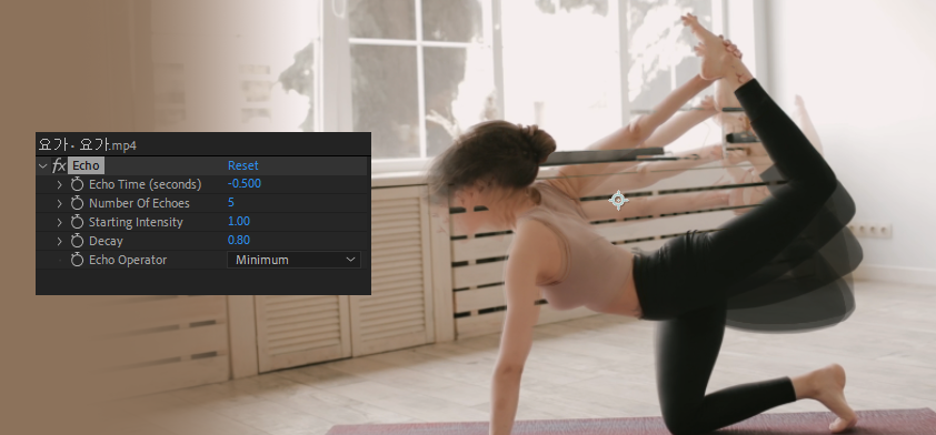 위 레이어의 비디오가 로토브러시 되면 피사체외는 비어 있습니다. 이 비어있는 부분을 잔상으로 처리하기 위해 아래는 echo 효과를 적용해주세요.