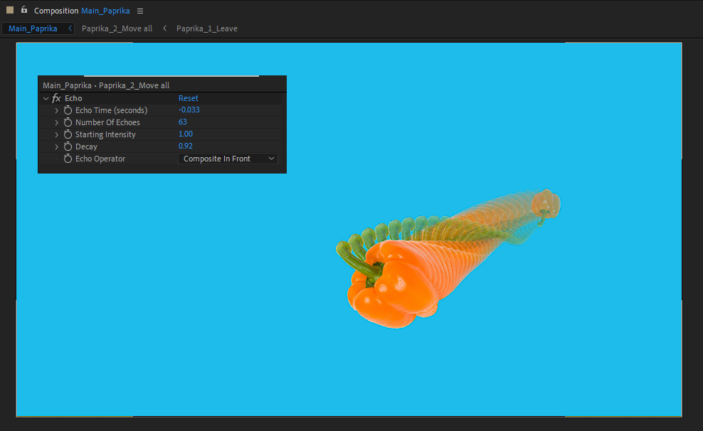 02 메인콤프에서 움직이는 2번째 재가공한 콤프는 Compositon in Front 오퍼레이터로 에코효과를 적용해봅니니다.