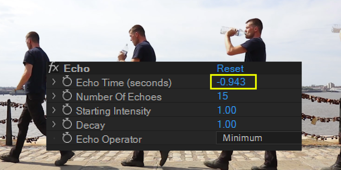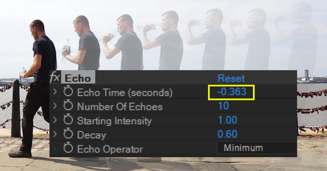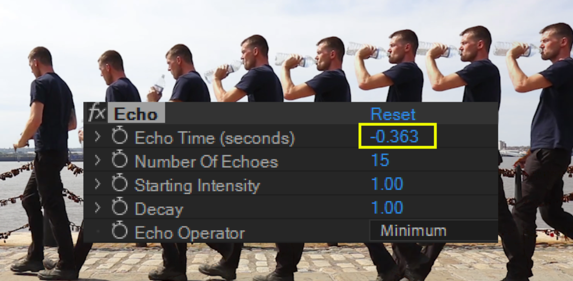 위에서 다양한 Echo효과를 영상에서 확인해보았습니다. Echo효과를 적용시에는 삼각대로 고정해 촬영한 영상이 아닌 주인공을 따라가거나 카메라가 흔들리는 경우 배경요소들과 마구 겹치게 보여서, Footage로서 적절한 카메라가 고정되있니 않은 비디오 클립은 Echo효과에는 부적절합니다. 카메라가 고정된 상태에서 촬영한 영상이 에코효과에 적절 합니다.