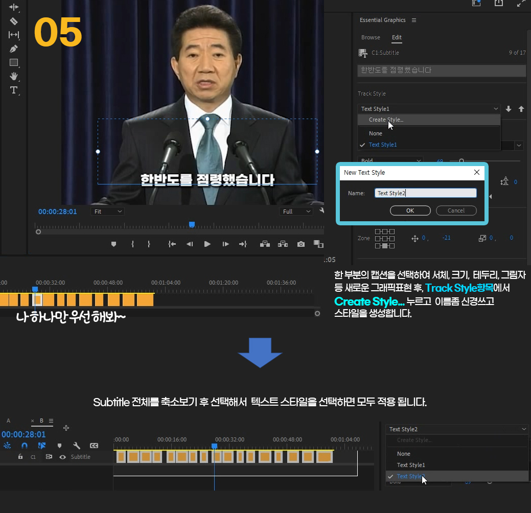 Style01. 한 부분의 캡션을 선택하여 서체, 크기, 테두리, 그림자 등 새로운 그래픽표현 후, Track Style항목에서 Create Style... 누르고 이름좀 신경쓰고 스타일을 생성합니다.