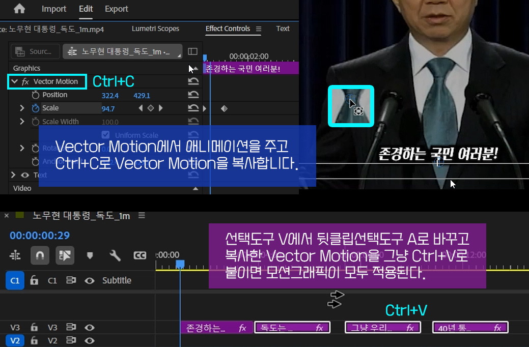 04. 툴바의 단축키를 활용해보세요. 주로 많이 사용하는 선택도구 V에서, 뒷클립선택하는 도구 A로 바꾸고 복사한 Vector Motion을 그냥 Ctrl+V로 붙이면 모션그래픽이 모두 적용된다.