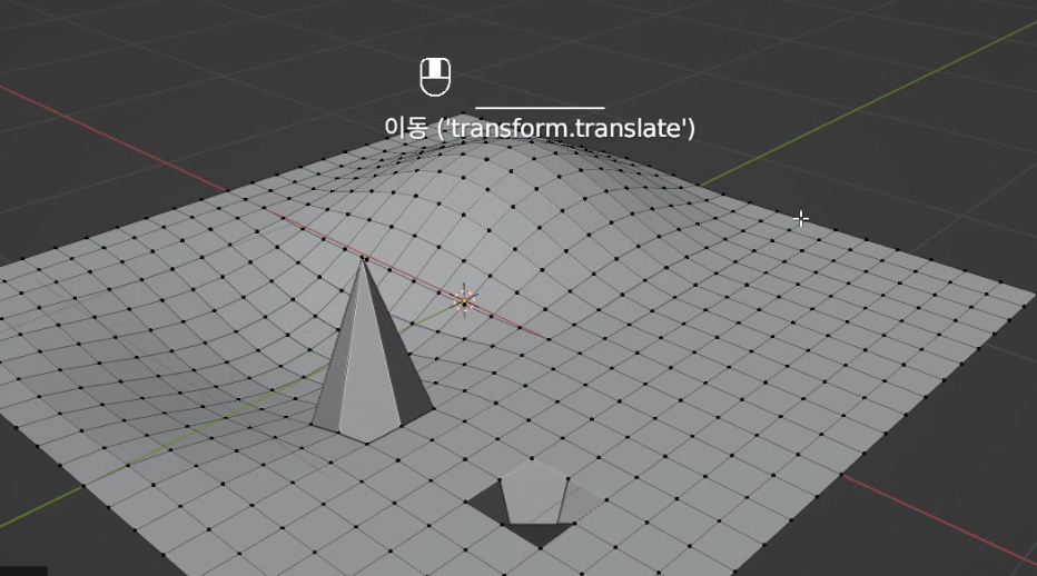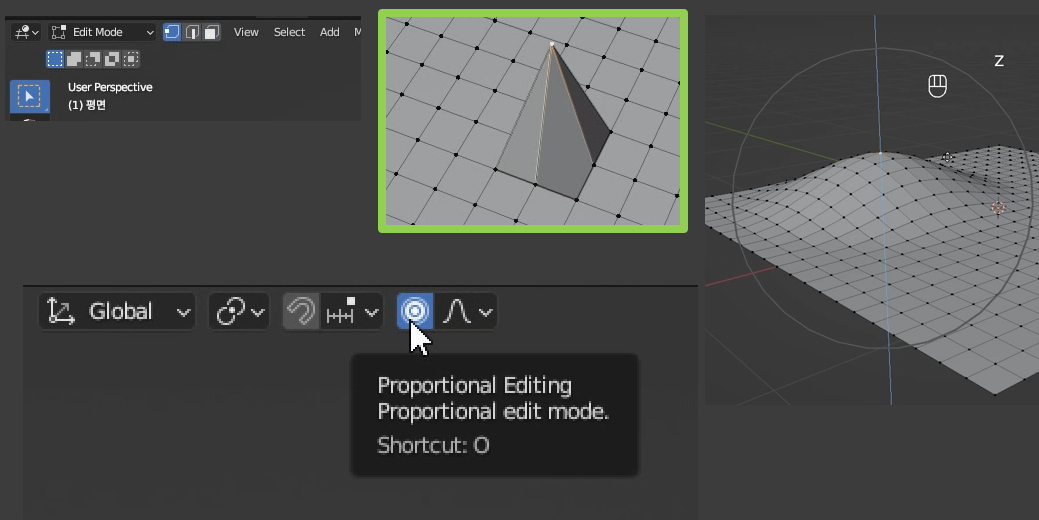 02. 에디트모드에서 평면(Plane)의 점을 하나 선택해서 G, Z로 올려봅니다. 뿔같이 하나만 올라가죠? 비례편집 오브젝트 버튼을 상단에서 체크하고 올리거나, 내려보면 일정한 행태로 주변이 끌려 움직입니다.
