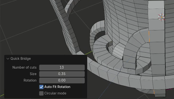 Bridge Edge Loops는 Edge전용의 편집명령이지만, Face의 선택한 면을 뭐든지 연결하는 애드온인 Quick Bridge을 설치하고 사용하면 뭐들지 연결한 인공적인 구조물을 만들 수 있다. 아래는 임의로 선택한 면 Face를 우클릭 하고 Quick Bridge를 적용하는 장면이다. 애드온은 아래 첨부했으니 설치 후 확인 해보는 것을 추천한다.