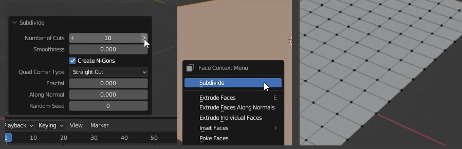 01. 평면(Plane)을 선택하고, Tab키 에디트모드로 들어가서 페이스(Face)선택후 우클릭 후에 서브디바이드를 적용한다. 우측하단의 옵션에서 필요한 만큼 면을 분할 해준다.