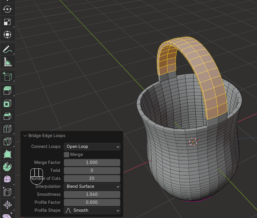 매번 꼭 연결할 면 Face를 지우고, Ctrl+E 3번째줄에서 선택한 Bridge Edge Loops (혹은 우클릭)창을 띄우고, Interpolation을 Blend Surface로 놓고 Smoothness를 약간 올리고, Number of Cut에 따라 부드럽게 마치 루프컷 하듯이 주면 기본 아치형상의 다리구조를 만드는 기본옵션이다.