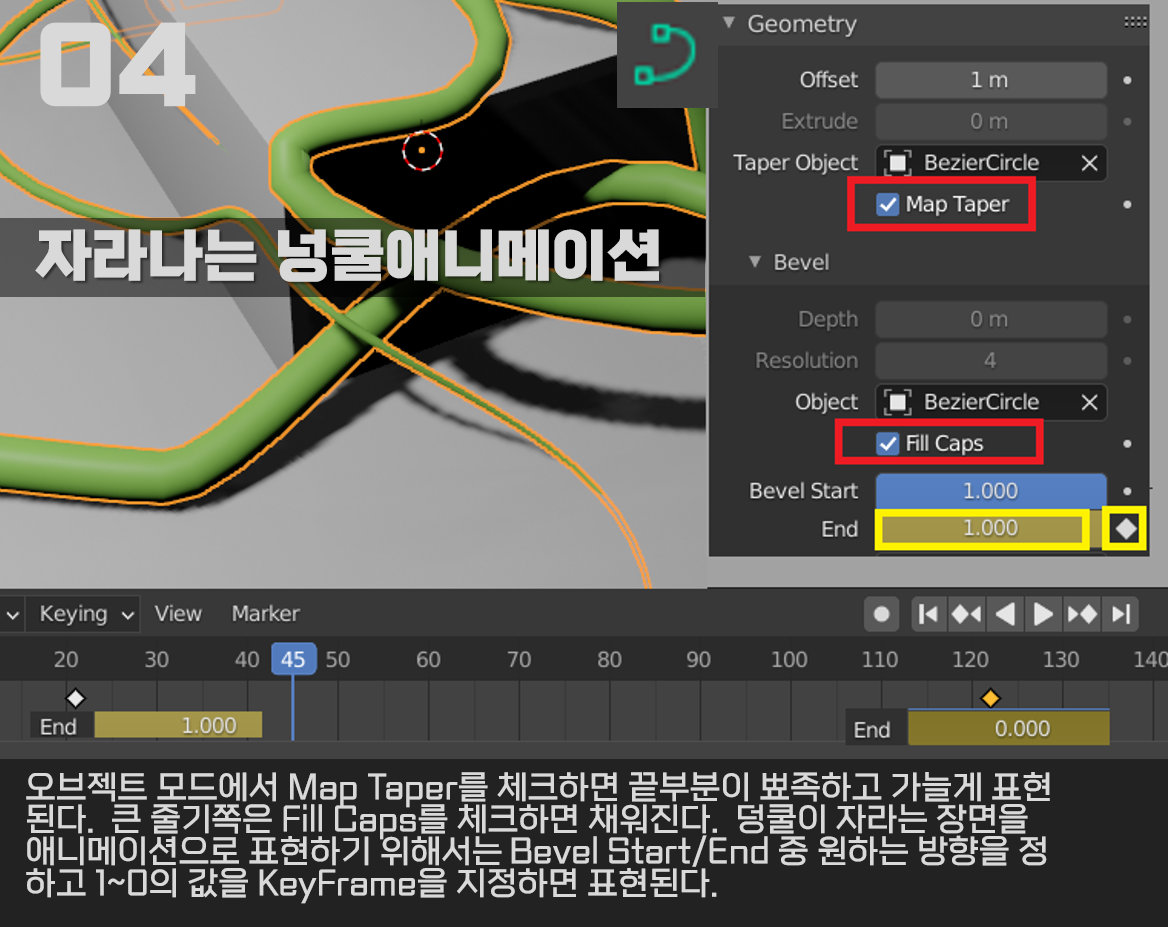 04. 자라나는 넝쿨애니메이션을 위해서는 우선 오브젝트 모드로 돌아와서 우측의 Curves의 속성창 Geometry에 속한 덩쿨이 자라는 장면을 애니메이션으로 표현하기 위해서는 Bevel Start/End 중 원하는 방향을 정하고 1~0의 값을 KeyFrame을 지정하면 애니메이션을 표현할 수 있다. 자라는 가는 줄기처럼 보이게 하기 위해 Map Taper를 체크하면 끝부분이 뾰족하고 가늘게 보이며 Bevel에서는 큰 줄기쪽은 Fill Caps를 체크하면 채워진다.