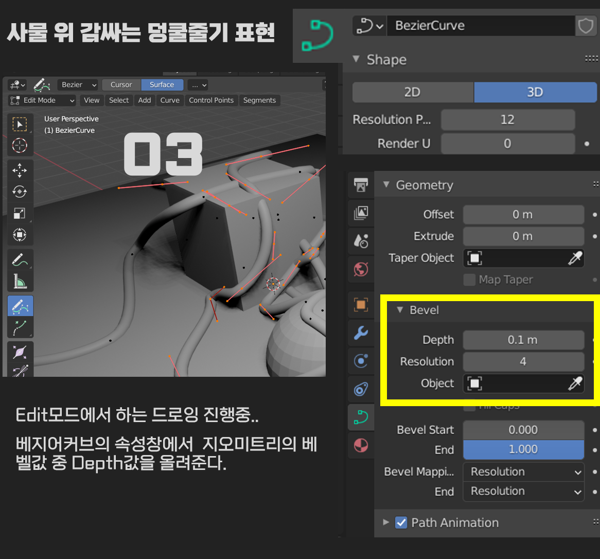 03. 사물 위 감싸는 덩쿨줄기 표현. Edit모드에서 하는 드로잉 진행중.. 베지어커브의 속성창에서 지오미트리의 베벨값 중 Depth값을 올려준다.