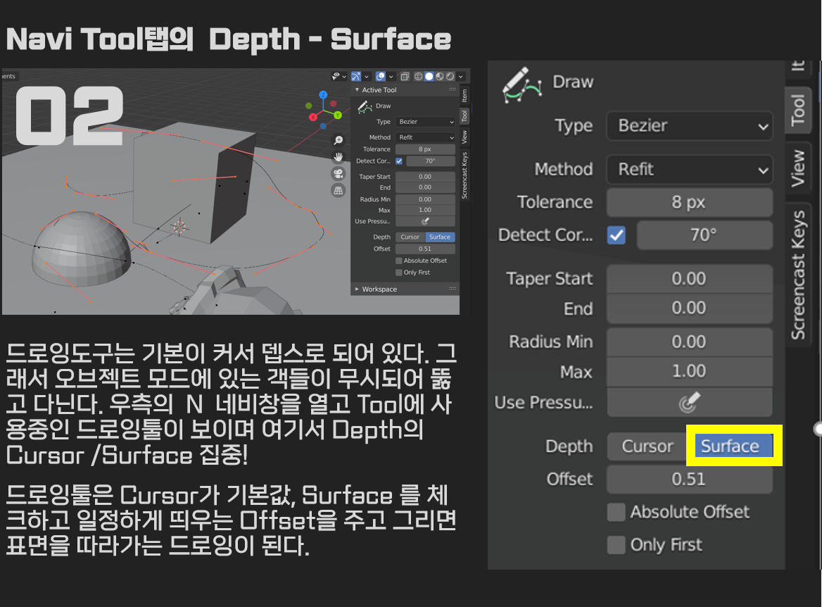 02. Navi Tool탭의Depth - Surface 베지어 커브가 드로잉도구는 기본이 커서 뎁스로 되어 있다. 그래서 오브젝트 모드에 있는 객들이 무시되어 뚫고 다닌다. 우측의 N 네비창을 열고 Tool에 사용중인 드로잉툴이 보이며 여기서 Depth의 Cursor /Surface 집중! 드로잉툴은 Cursor가 기본값, Surface 를 체크하고 일정하게 띄우는 Offset을 주고 그리면 표면을 따라가는 드로잉이 된다.