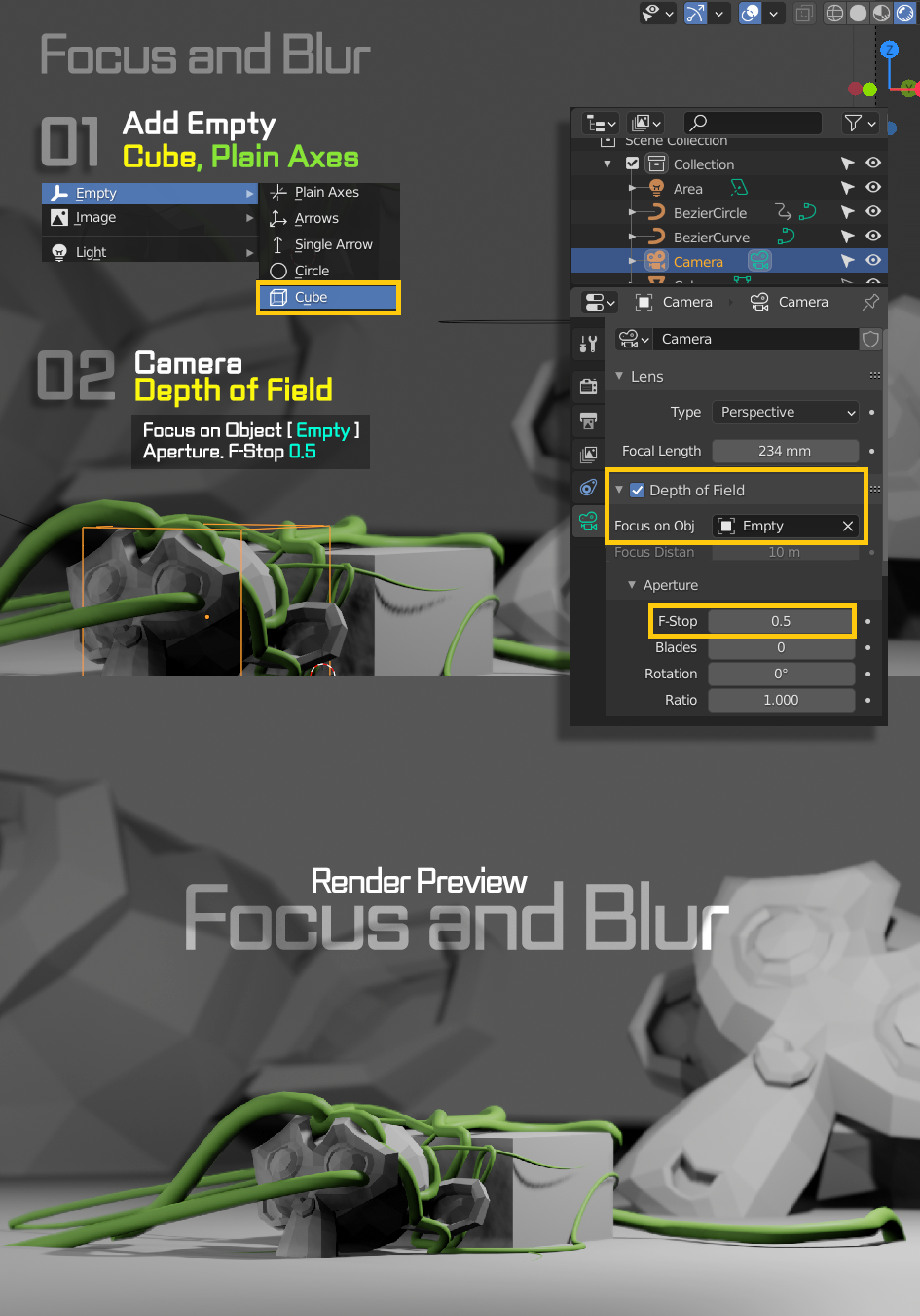렌더링을 위한 멋진 포커스를 잡고 피사체 촬영준비. 사진 한장을 작품같은 카메라 포커스 블러를 연출해봅니다. 특정한 피사체의 주인공을 지정해도 되지만 화면에 일정한 영역을 포커스로 정하기 쉬운 Empty 중에서 Cube, Plain Axes 중에서 하나를 추가하고 적절한 위치를 잡아 Focus Target 역할을 시킬 것 입니다. 특정 카메라를 지정하고 속성창에서 Depth of Field 를 체크해줍니다. 다음으로 Focus on Object Target [ Empty ] / Aperture. F-Stop 0.5 카메라 뷰 [ 0 ] 키로 확인하고, F12를 눌러서 렌더이미지 뷰로 확인을 해봅니다.