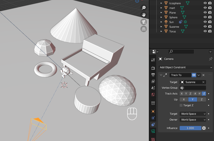 Light과 Camera라가 주인공 Object를 Target으로 따라다니는 것은 Constraint의 Track to를 추가하고 Target을 지정하면 된다. 이때 Empty Cube를 지정하는 것도 가능하다.