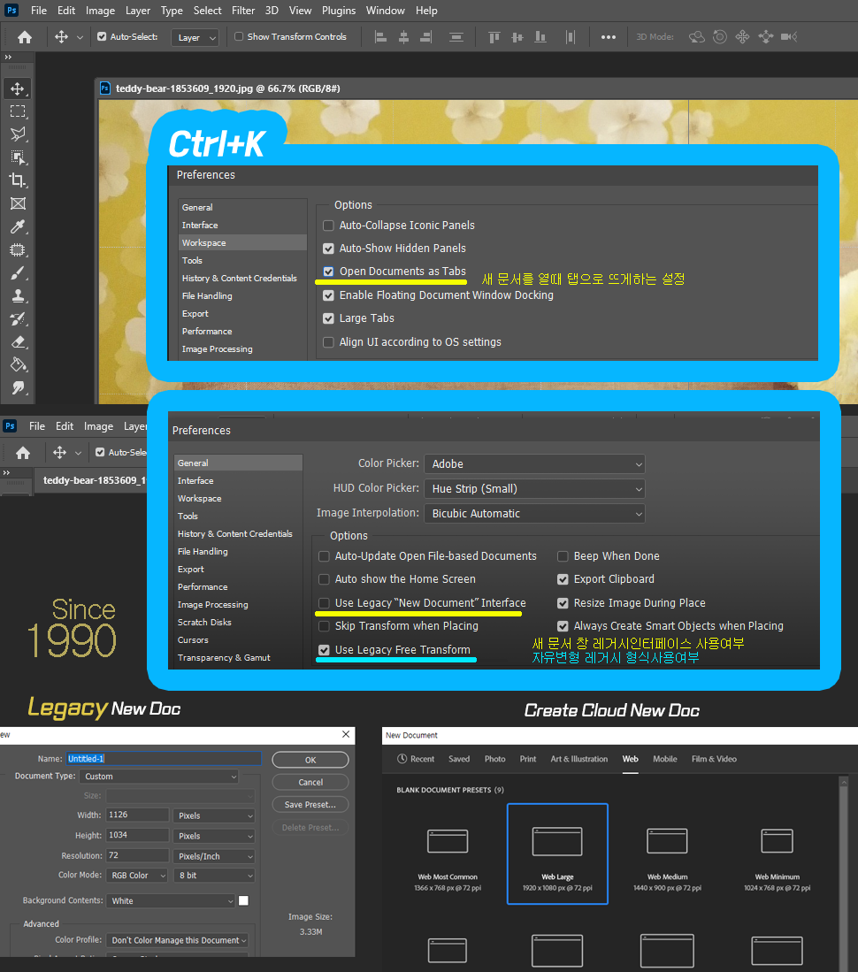 포토샵 편집메뉴의 설정은 스마트폰의 설정과 같아서 개인 취향마다 다르게 사용한다. 하지만 작업에 불편을 주는 설정을 바로잡는 설정옵션을 소개하여 혼돈을 막고자 정리해보았습니다. Edit메뉴의 Preferences-General 로 바로가는 단축키인Ctrl+K를 통해서 빠른 접근이 가능합니다.