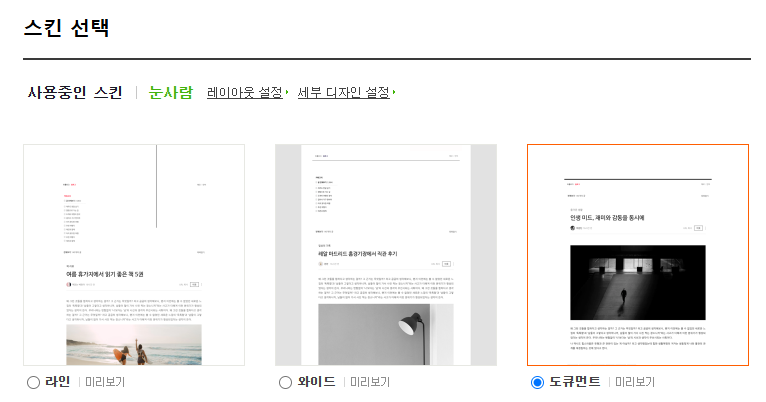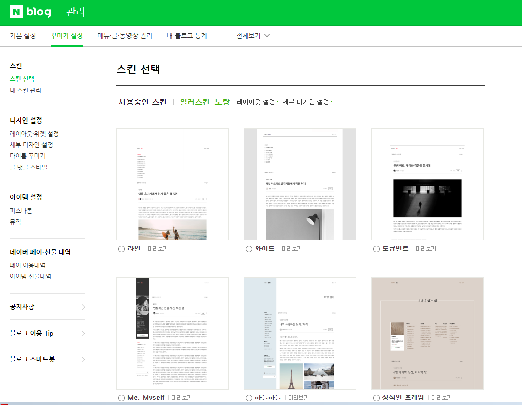03. [ 꾸미기 설정 ]에서 상단부분이 여유있는 스킨을 선택합니다. 대부분 상단의 위젯을 누르고 이동하는 것이 좋기때문입니다. 개별적인 레이아웃을 바꿀 수 있으니 아래 보이는 첫줄의 기본형 3개 중 하나를 골라 주세요. 그리고, 사용중인 스킨 줄의 레이아웃 설정을 클릭해서 이동합니다.