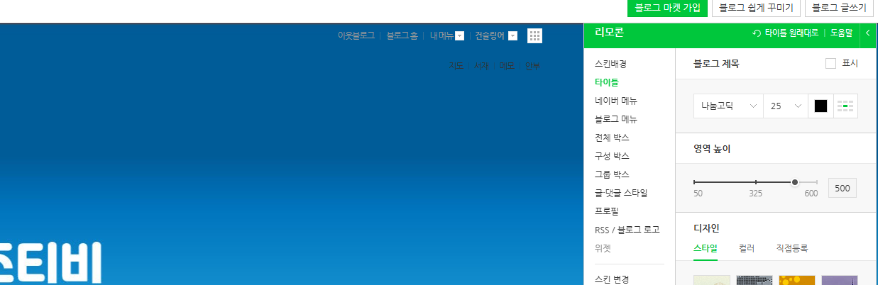 B01. 우선 타이틀에서 블로그제목을 표시체크를 꺼주세요. 영역의 높이는 500으로 하세요.