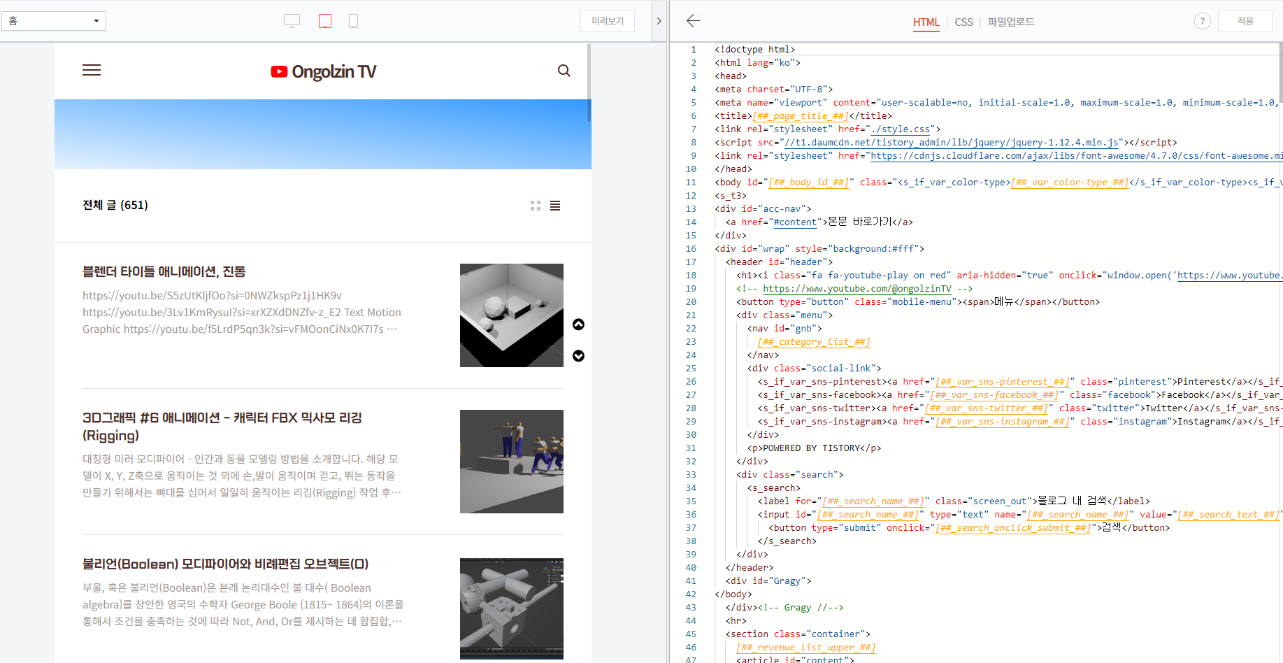 다음카카오의 블로그인 티스토리의 장점은 HTML, CSS를 사용할 수 있는 웹디자이너라면 기본 HTML소스에 원하는 스타일을 CSS로 표현할 수 있습니다.