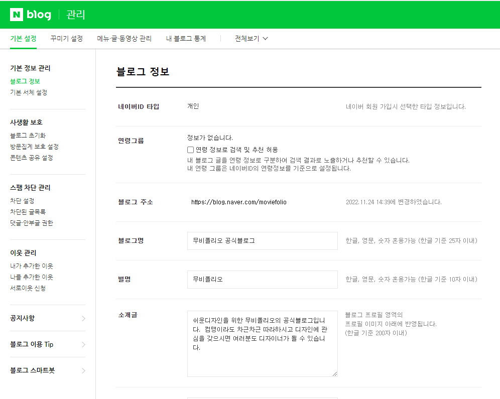 02. [ 기본설정 ]에 블로그 정보를 잘 입력 및 수정을 합니다. 새롭게 만든 포트폴리오용 ID가 블로그 주소가 보여집니다. 이 http라는 프로토콜로 시작하는 긴 URL이 여러분의 포트폴리오 홈페이지라 생각하면 됩니다.