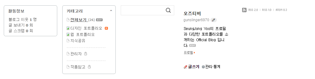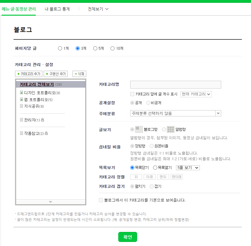 [ 카테고리 관리 및 설정] 에서 카테고리 추가 누르고 카테고리를 추가 및 수정를 하며, 우측의 공개설정에서 포트폴리오와 같이 공개할 게시판은 ●공개를 하고, 작품구상을 위한 자료수집 및 개인정보를 담은 자료는 ◎비공개해야 합니다. 추가 및 수정 그리고 공개여부를 정하고는 [확인]버튼을 누르고 나갑니다.
