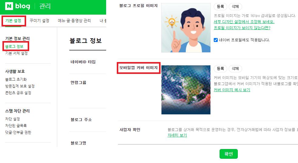 위젯과 타이틀높이를 높인 타이틀없는 공간을 스킨배경 디자인으로 구성한 내용은 PC에서 보는 화면구성입니다. 모바일은 네이버에서 반응형이 아닌 별도 모바일 버전의 이미지와 로고 등으로 가볍게 꾸밀 수 있습니다. 역시 [관리] 페이지 기본설정 하단에 블로그 프로필이미지와 모바일앱 커버이미지를 아래 이미지를 참고해서 디자인 후 적용하시면 좋겠습니다.